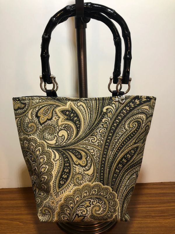 This elegant bag with classic paisley fabric features black banboo handles and magnatic snap closure